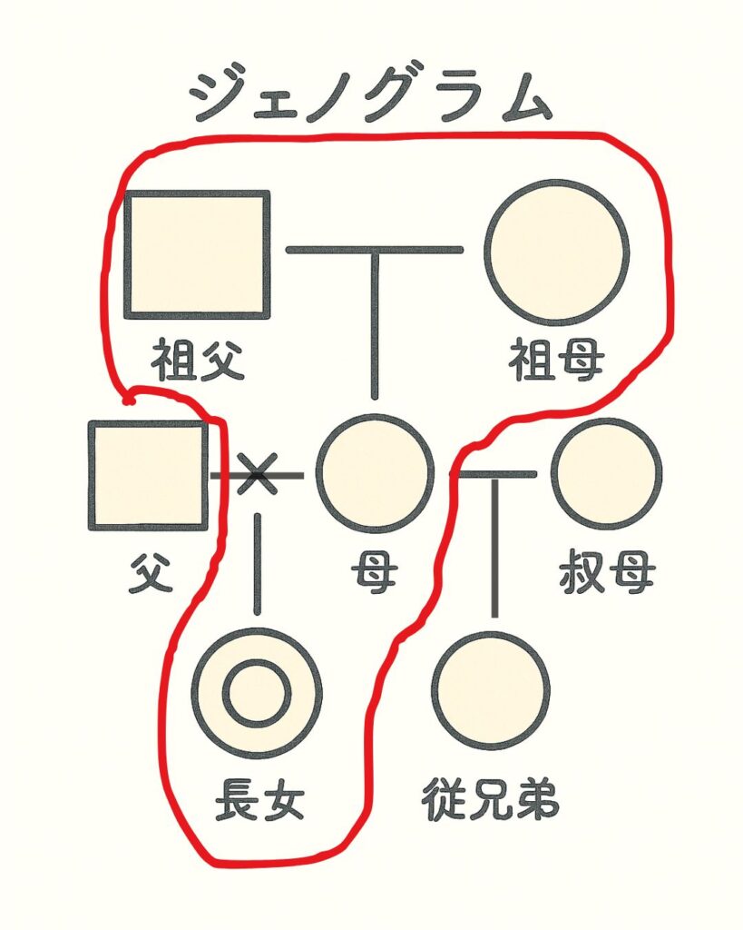 家族とは自分以外にも血がつながった人達がいますよね。それを図面にしてつなげていくと家系図のようにつながっていきます(下記の図で、これを「ジェノグラム」と言います)。